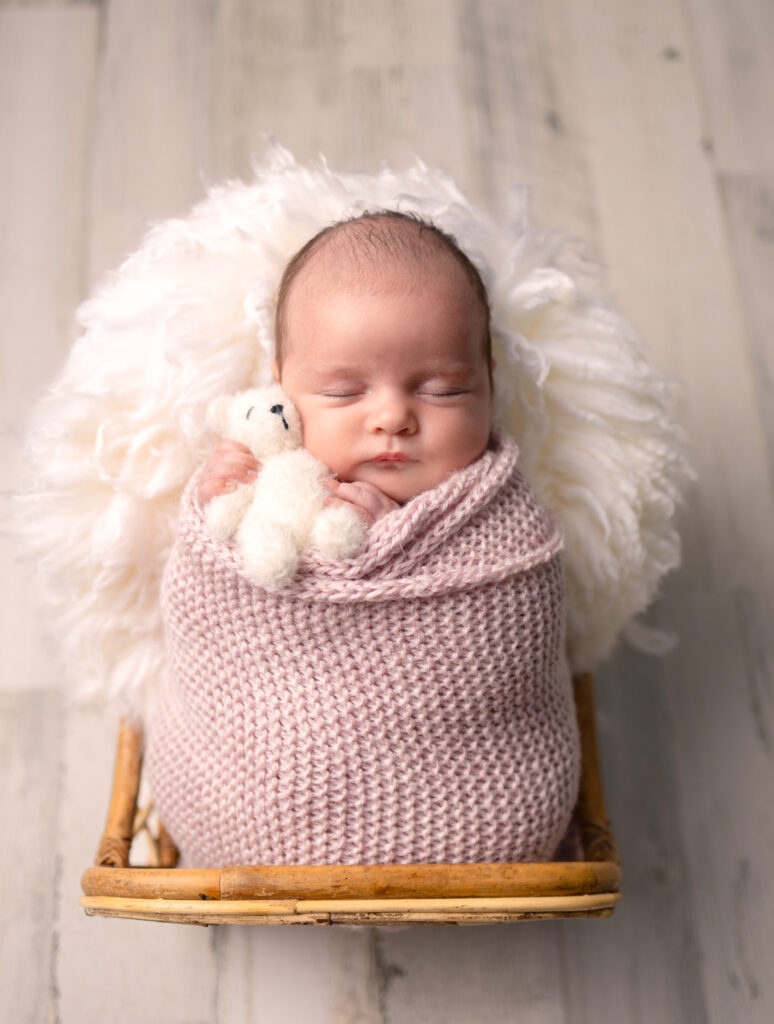 Once we’ve finished a few table poses and macro images, I’ll dress baby in an outfit or wrap them up snuggly. Most babies prefer being warm and cozy, so wrapping helps them feel secure and stay peacefully asleep.