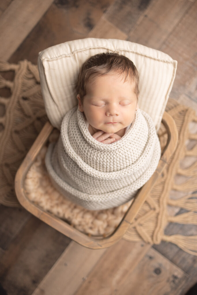 The chin on hands pose is a classic favorite! It creates a sweet, peaceful look that many parents love for announcements and keepsakes. Because this pose requires careful positioning, it is always done with full support and gentle adjustments. The result is a soft, timeless portrait that never goes out of style.
